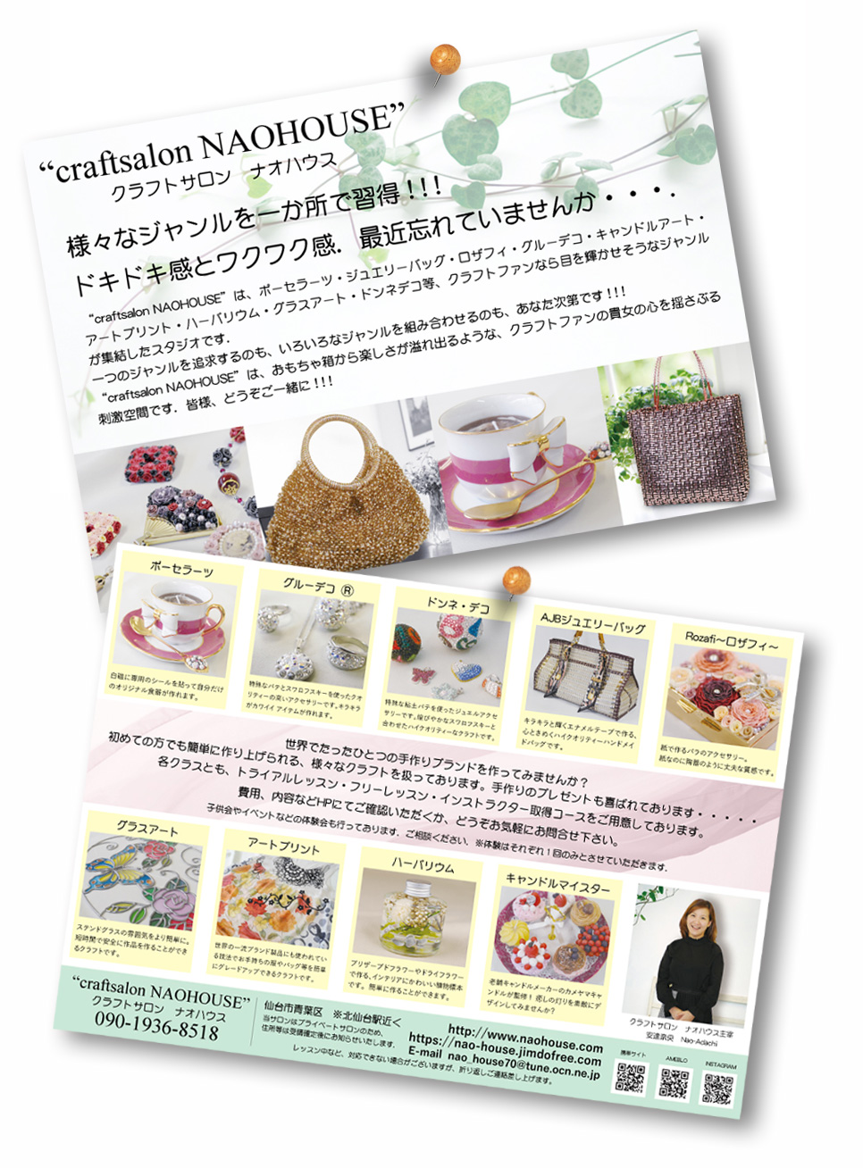 “クラフトサロン・ナオハウス”は、ポーセラーツ、ロザフィ、グルーデコ、キャンドルアート、アートプリント、グラスアート、ドンネデコ等、クラフトファンなら目を輝かせそうなジャンルが集結したスタジオです.
